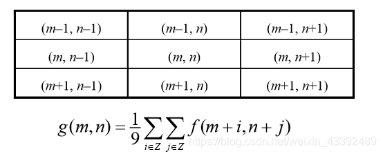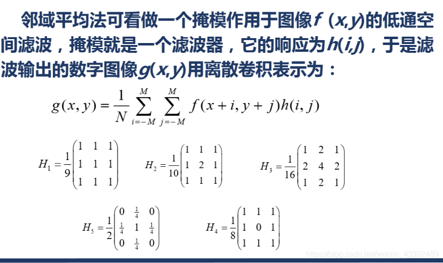 •因此,可用邻域内各像素的灰度平均值代替该像素原来 的灰度值,实现图像的平滑。