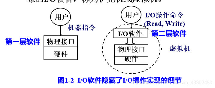 - 裸机覆盖了一层I/O设备管理软件如图1-2所示,由它来实现对I/O设备操作的细节,并向上提供一组I/O操作命令,如Read和Write命令,用户可以利用它进行数据输入/输出,而无需关心I/O实现的细节。此时用户所看到的是一台功能显著增强、使用极为方便的的机器,它向上提供了一组抽象的I/O设备,称为扩充机或虚拟机。
