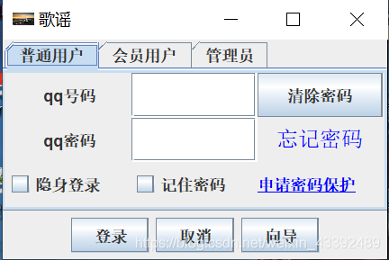 public class test15 extends JFrame {JLabel bq1;//北部JButton an1,an2,an3; JPanel mb1;//南部JTabbedPane xxk;//中部JPanel mb2,mb3,mb4;JLabel bq2,bq3,bq4,bq5;JTextField wbk;JPasswordField mmk;JButton an4;JCheckBox fxk1,fxk2;public static void main(String[] args){test15 lx1=new test15();//主函数调用即可}//定义一个构造器public test15(){bq2=new JLabel("qq号码",JLabel.CENTER);bq3=new JLabel("qq密码",JLabel.CENTER);bq4=new JLabel("忘记密码",JLabel.CENTER);bq4.setFont(new Font("宋体",Font.PLAIN,16));bq4.setForeground(Color.blue);bq5=new JLabel("<html><a href='www.qq.com'>申请密码保护</a>");bq5.setCursor(Cursor.getPredefinedCursor(Cursor.HAND_CURSOR));//鼠标放入变成一个小手wbk=new JTextField();mmk=new JPasswordField();an4=new JButton("清除密码");fxk1=new JCheckBox("隐身登录");fxk2=new JCheckBox("记住密码");bq1=new JLabel();mb1=new JPanel();an1=new JButton("登录");an2=new JButton("取消");an3=new JButton("向导");xxk=new JTabbedPane();//中部mb2=new JPanel();mb3=new JPanel();mb3.setBackground(Color.BLUE);mb4=new JPanel();mb4.setBackground(Color.cyan);xxk.add("普通用户",mb2);xxk.add("会员用户",mb3);xxk.add("管理员",mb4);mb2.setLayout(new GridLayout(3,3));mb1.add(an1);mb1.add(an2);mb1.add(an3);mb2.add(bq2);mb2.add(wbk);mb2.add(an4);mb2.add(bq3);mb2.add(mmk);mb2.add(bq4);mb2.add(fxk1);mb2.add(fxk2);mb2.add(bq5);this.add(mb1,BorderLayout.SOUTH);this.add(bq1,BorderLayout.NORTH);this.add(xxk,BorderLayout.CENTER);ImageIcon tp1=new ImageIcon("image.jpeg");//设置标题this.setTitle("歌谣");//设置初始位置this.setLocation(100,100);//设置大小this.setSize(300,200);this.setIconImage(tp1.getImage());//释放窗口关闭的资源,这个要写对this.setDefaultCloseOperation(JFrame.EXIT_ON_CLOSE);//显示界面this.setVisible(true);//1继承jframe类//2在最上方定义组件//3在构造方法中创建组件//4在构造方法添加组件//5设置窗体属性//6显示窗体//7在主函数创建对象}