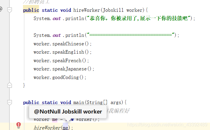 public class WorkerAssit implements Jobskill{//这个人有自己的助理翻译,这里是使用了组合的方式private Worker worker;//在构造方法中传进来public WorkerAssit(Worker worker){this.worker = worker;}public void goodCoding() {worker.goodCoding();}public void speakChinese() {//worker会说,直接用workerworker.speakChinese();}public void speakEnglish() {//英语他不会说,这就要助手出马翻译了System.out.println("我是他的翻译,他说 Hello World.");}public void speakJapanese() {//日语他也不会说,这还是要助手出马翻译了System.out.println("我说说日语,谢谢");}public void speakFrench() {//每错,他英语也不行System.out.println("He can say English too.");}}