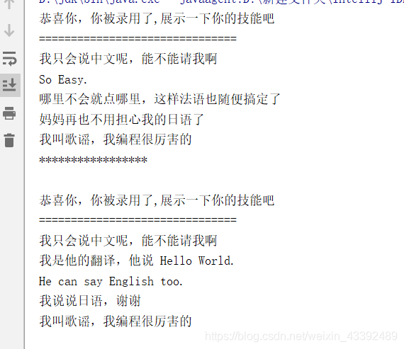 public class Test {//招聘员工public static void hireWorker(Jobskill worker){System.out .println("恭喜你,你被录用了,展示一下你的技能吧");System.out .println("===============================");worker.speakChinese();worker.speakEnglish();worker.speakFrench();worker.speakJapanese();worker.goodCoding();}public static void main(String[] args){//我是个只会说中文的工人 ,但我编程好Worker me = new Worker();Assist bbg = new Assist();hireWorker(bbg);System.out.println("*****************\r\n");//这个自带助理的,是使用了组合的方式,是对象的适配模式WorkerAssit gfs = new WorkerAssit(me);hireWorker(gfs);//hireWorker(me);//直接招聘是不行了// 以上代码为初始状态,后面的代码是后面根据需求增加的}}