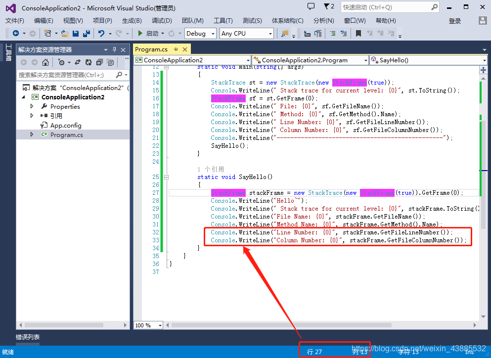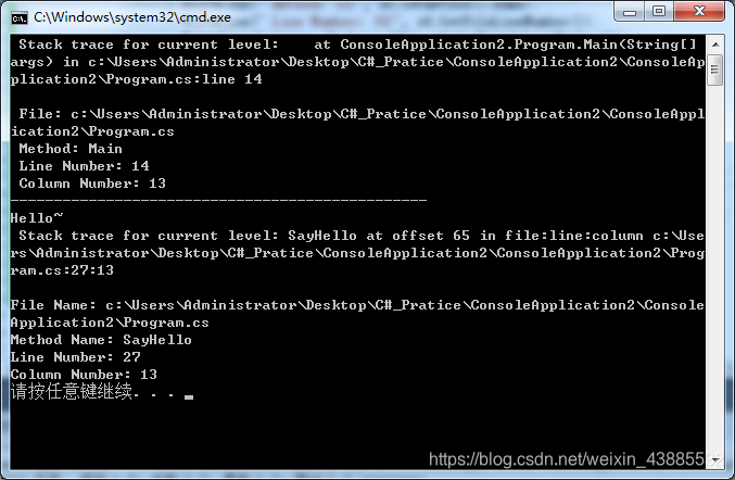 {class Program{static void Main(string[] args){StackTrace st = new StackTrace(new StackFrame(true));Console.WriteLine(" Stack trace for current level: {0}", st.ToString());StackFrame sf = st.GetFrame(0);Console.WriteLine(" File: {0}", sf.GetFileName());Console.WriteLine(" Method: {0}", sf.GetMethod().Name);Console.WriteLine(" Line Number: {0}", sf.GetFileLineNumber());Console.WriteLine(" Column Number: {0}", sf.GetFileColumnNumber());Console.WriteLine("------------------------------------------------");SayHello();}static void SayHello(){StackFrame stackFrame = new StackTrace(new StackFrame(true)).GetFrame(0);Console.WriteLine("Hello~");Console.WriteLine(" Stack trace for current level: {0}", stackFrame.ToString());Console.WriteLine("File Name: {0}", stackFrame.GetFileName());Console.WriteLine("Method Name: {0}", stackFrame.GetMethod().Name);Console.WriteLine("Line Number: {0}", stackFrame.GetFileLineNumber());Console.WriteLine("Column Number: {0}", stackFrame.GetFileColumnNumber());}}