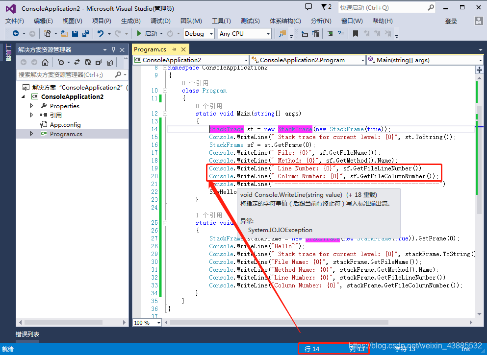 Main方法中的StackTrace对象定义位置(行和列)如下: