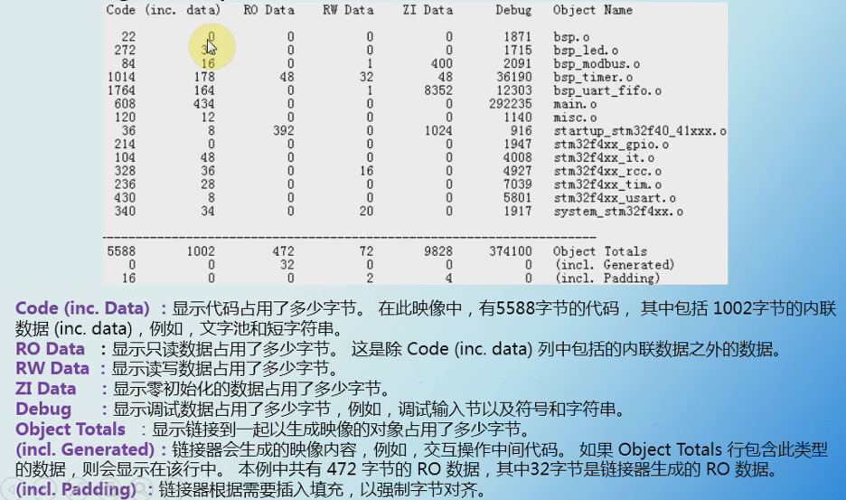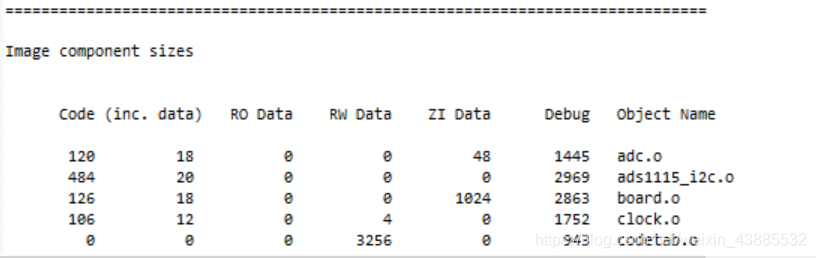 该部分描述了映像文件的组件大小,组件指的是单个的源文件,因为一个项目工程是由很多个.c文件组成的。这里会列举单个.c文件所占用的空间大小(RAM和ROM),具体为Code、inc.data(内联函数)、RO-Data、RW-Data、ZI-Data,并根据这些信息统计出程序占据的总RAM和ROM空间的大小。