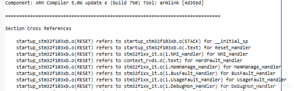 第一行startup_stm32f103xb.o(RESET) refers to startup_stm32f103xb.o(STACK) for __initial_sp说明:startup_stm32f103xb.o文件中的“RESET”段为它使用的__initial_sp引用了startup_stm32f103xb.o文件中的“STACK”段。