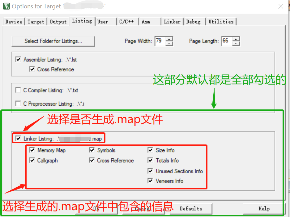 在MDK5中,生成的.map文件包含的内容可以在Options for Target--->Listing中如下界面中进行配置,默认是全选的,用户也可以根据自己的需求进行选择,如只生成Total info信息。在配置好map生成选项后编译整个工程,双击Project框中的项目名称即可打开.map文件。若使用的是STM32CubeMX生成的工程,则可能双击无法打开.map文件,具体解决方法参考这篇文章: