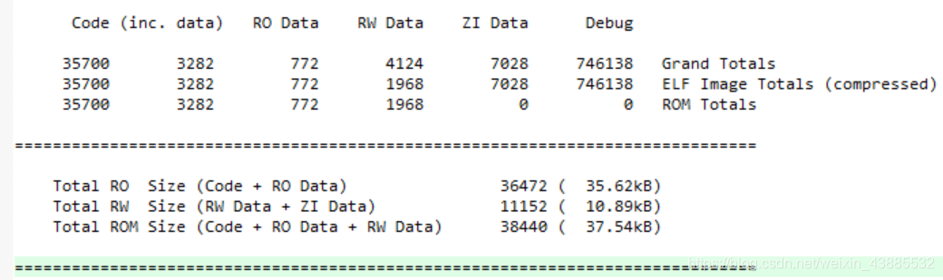 从如上汇总信息可以看出,整个程序下载到STM32的ROM(FLASH)中时占用的空间大小为从0x08000000开始的38440字节 (Code + RO Data + RW Data) 。当程序运行时,占用的RAM空间大小为从0x20000000开始的11152字节(RW Data + ZI Data)。
