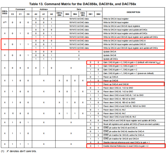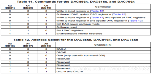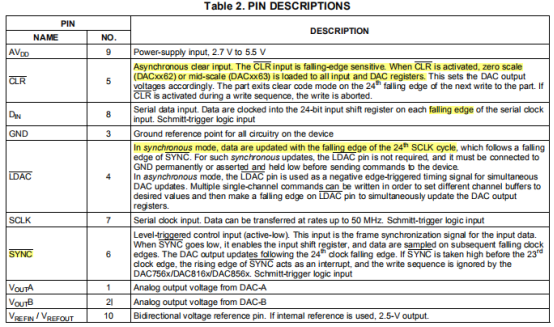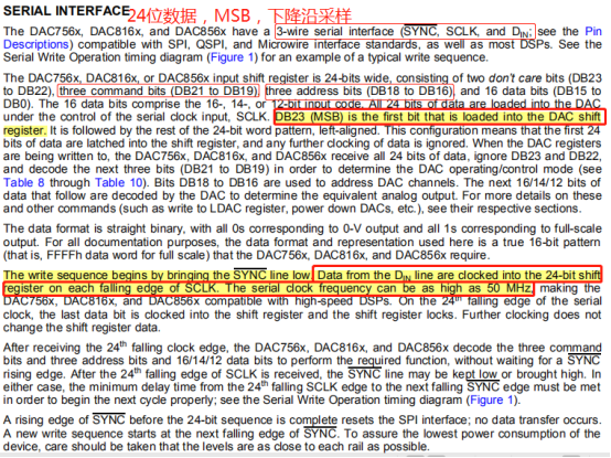 6、【SYNC】 片选,电平触发(低电平)而非边沿触发,为低时才会采样数据至DAC寄存器。DAC通道的输出电压在第24个时钟下降沿之后更新。若在第23个时钟边沿之前SYNC被拉高,则忽略本次写操作