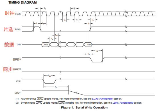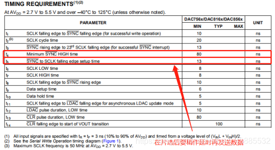 【t5】从SYNC即片选拉低到SCLK第一个下降沿的时间,至少为13nS,因此在片选后要稍作延时再进行数据的发送