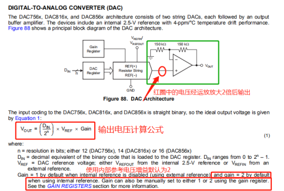 - 内部自带2.5V参考电压。使用内部参考电压时,DAC通道输出电压根据增益设置的不同可输出0~2.5V(增益为1)或0~5V(增益为2,默认)