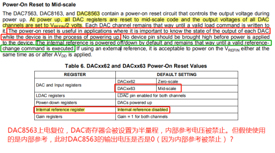 根据DAC8563上电复位的描述,在上电时DAC寄存器都会被设置为半量程,即寄存器中值为32768,所有通道的输出电压为VREFIN/2。这里有一个疑问,假使使用的是内部参考,又因为在上电时内部参考被禁止,等效于VREFIN为0V,因此所有通道的输出电压在软件未启动时输出仍是0V。