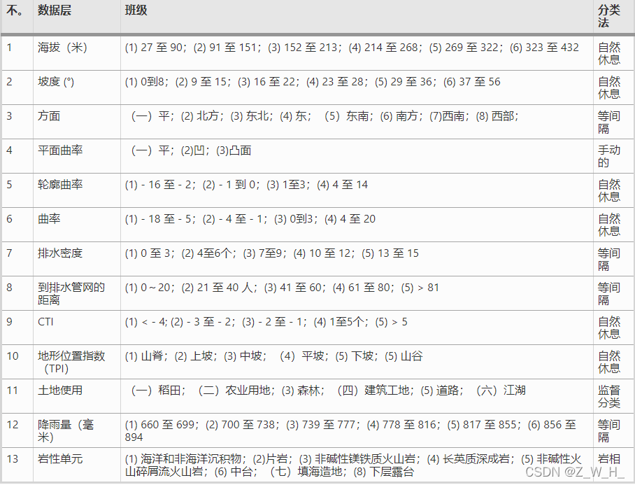 迄今为止,对于诱发因素的选择尚无正常规律或普遍共识。坡度、坡向、岩性、平面曲率和排水密度是最广泛使用的诱发因素,诱发因素应根据滑坡的触发机制、滑坡类型、案例研究区域的特征、可用的数据集和使用的模型