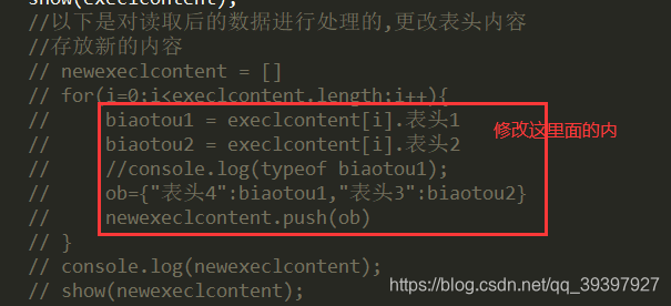 <body><div id='result'><div><input type="file" id="excel-file"></div><div id="readingdata">运行当中。。。。。。</div></div><script src="https://cdn.jsdelivr.net/npm/jquery@1.12.4/dist/jquery.min.js"></script><script>$("#readingdata").hide()var province = document.getElementById("input")//获取输入框元素//execl读取$('#excel-file').change(function(e) {$("#readingdata").show()//存放读取内容var execlcontent = [];var files = e.target.files;//查看路径是否正确console.log("文件路径");console.log(files);//文件读取对象var fileReader = new FileReader();fileReader.onload = function(ev) {try {var data = ev.target.resultworkbook = XLSX.read(data, {type: 'binary'// 以二进制流方式读取得到整份excel表格对象})} catch (e) {console.log('文件类型不正确');return;}// 表格的表格范围,可用于判断表头是否数量是否正确var fromTo = '';// 遍历每张表读取for (var sheet in workbook.Sheets) {if (workbook.Sheets.hasOwnProperty(sheet)) {fromTo = workbook.Sheets[sheet]['!ref'];console.log(fromTo);execlcontent = execlcontent.concat(XLSX.utils.sheet_to_json(workbook.Sheets[sheet]));break; // 如果读取多张表,就取消注释这行}}console.log(execlcontent);show(execlcontent);//以下是对读取后的数据进行处理的,更改表头内容//存放新的内容// newexeclcontent = []// for(i=0;i<execlcontent.length;i++){// biaotou1 = execlcontent[i].表头1// biaotou2 = execlcontent[i].表头2// //console.log(typeof biaotou1);// ob={"表头4":biaotou1,"表头3":biaotou2}// newexeclcontent.push(ob)// }// console.log(newexeclcontent);// show(newexeclcontent);};// 以二进制方式打开文件fileReader.readAsBinaryString(files[0]);});//读取内容展示function show(excontent){$("#readingdata").text("读取完成!!!!!");json=excontent//创建tablevar table=document.createElement("table");//创建thead,并追加到table中var thead=document.createElement("thead");table.appendChild(thead);//创建tr,并追加到theadvar tr=document.createElement("tr");thead.appendChild(tr);//json数组中第1个人的每个属性for(var key in json[0]){//创建thvar th=document.createElement("th");//设置th的内容为keyth.innerHTML=key;//将th追加到tr中tr.appendChild(th);}//创建tbody元素var tbody=document.createElement("tbody");//将tbody追加到table中table.appendChild(tbody);//遍历json中所有员工for(var i=0;i<json.length;i++){//创建trvar tr=document.createElement("tr");//遍历当前员工的每个属性for(var key in json[i]){//创建tdvar td=document.createElement("td");//设置td的内容为当前员工的当前属性值td.innerHTML=json[i][key];//将td追加到trtr.appendChild(td);}//(遍历结束)//将tr追加到tbody中tbody.appendChild(tr);}//将table添加到id为data的div下document.getElementById("readingdata").appendChild(table);}</script>