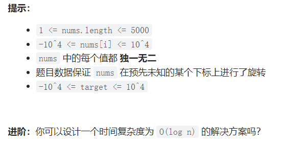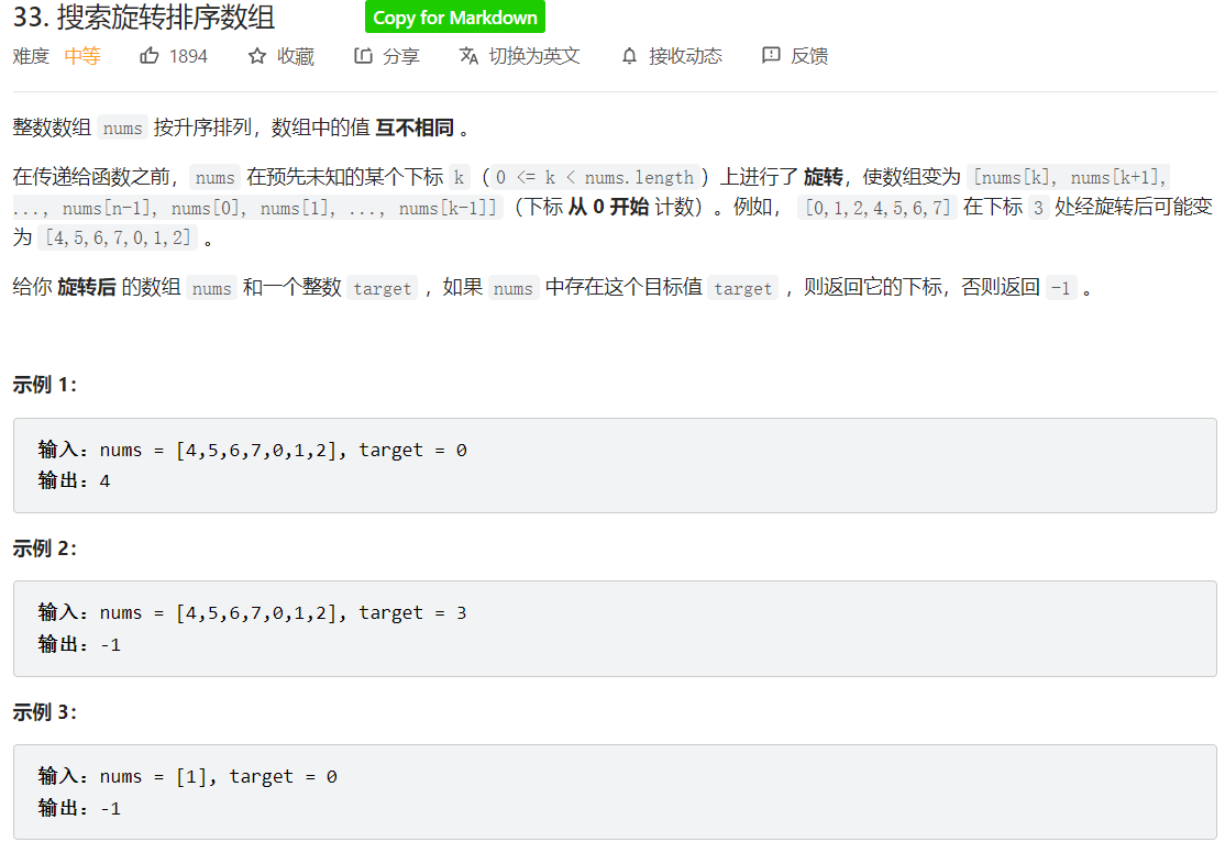 public:int search(vector<int>& nums, int target) {int n = nums.size();int l = 0, r = n-1;int mid, tar=n;//这里的细节,因为有可能进不到tar=mid那里while(l<=r) {mid = (l+r)/2;if(nums[mid] < nums[0]) {//这里的细节,不能是<=tar = mid;r = mid-1;} else {l = mid+1;}}if(tar == 0) tar = n;//这里的细节,保证一致。if(target >= nums[0]) {l = 0, r = tar-1;} else {l = tar, r = n-1;}while(l<=r) {int mid = (l+r)/2;if(nums[mid] > target) r = mid-1;else if(nums[mid] < target) l = mid+1;else return mid;} return -1;}