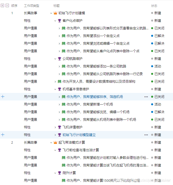 在 Azure Board 中,记录需求有三种类型:长篇故事(Epic)、特性(Feature) 和 用户故事/情景(User Story),而他们的结构一般都是父子关系,即 长篇故事 (需要完成的需求)-> 特性(将该需求分成几个阶段完成) -> 情景(描述具体到 角色-操作-效果)->WorkItem(具体实现)。接下来我将以 “一个找工作的网站” 来作为例子,顺便也会提及一些敏捷开发的知识来做需求管理。