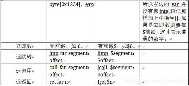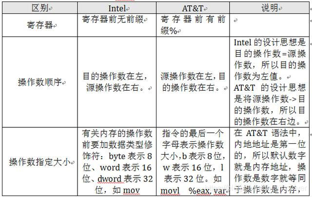 无论语法再怎么变,汇编语言中指令关键字肯定不能有太大出入,名字非常接近,只是在指令名字的最后加上了操作数大小后缀,b表示1字节,w表示2字节,l表示4字节。比如压栈指令,intel中是push,AT&T中是pushl,最后这个’l’表示压入4字节(long型大小)。在了解intel汇编指令的情况下,基本上能够看懂AT&T的汇编指令。它们的主要差别是语法风格,咱们对照着看下这两种风格的区别吧。