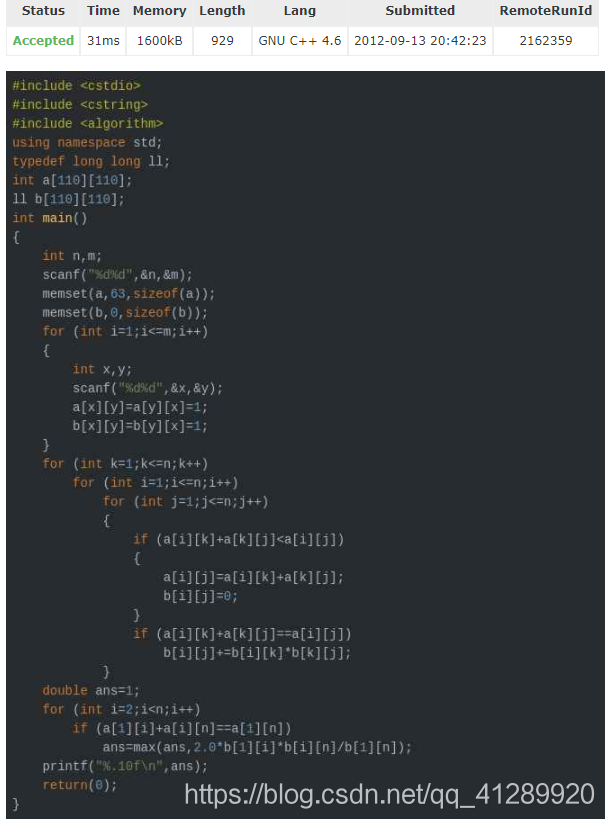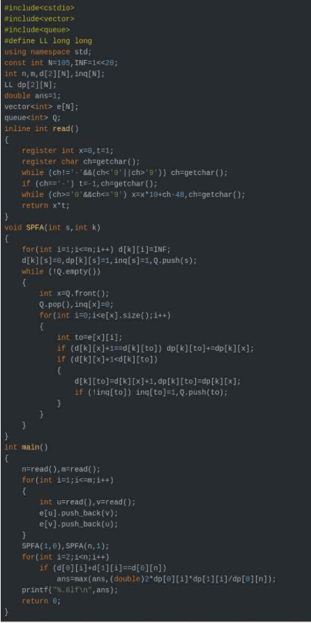 {int n,m; int u,v;cin>>n>>m;memset(maze,INF,sizeof maze);while(m--) {scanf("%d%d",&u,&v);maze[u][v] = maze[v][u] = 1;dp[u][v] = dp[v][u] = 1;} double ans = 1.0;for(int k = 1; k<=n; k++) {for(int i = 1; i<=n; i++) {for(int j = 1; j<=n; j++) {if(maze[i][j] == maze[i][k] + maze[k][j]) {dp[i][j] += dp[i][k] * dp[k][j];}else if(maze[i][j] > maze[i][k] + maze[k][j]) {maze[i][j] = maze[i][k] + maze[k][j];dp[i][j] = dp[i][k] * dp[k][j];}}}}for(int i = 2; i<=n-1; i++) {if(maze[1][i] + maze[i][n] == maze[1][n])ans = max(ans,2.0*(dp[1][i]*dp[i][n])/dp[1][n]);}printf("%.12f",ans);return 0 ;}