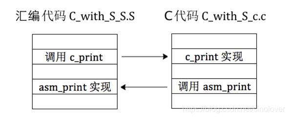 代码C_with_S_c.c中的函数c_print是被汇编代码C_with_S_S.S调用的,在c_print的实现中,它又调用汇编代码中的asm_print。它们的关系如图