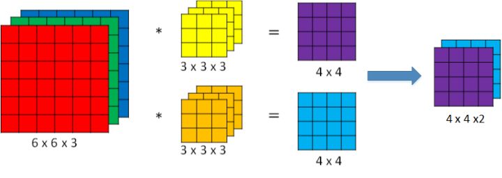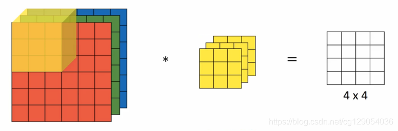 如果我们想要对三通道的 RGB 图片进行卷积运算,那么其对应的滤波器组也同样是三通道的。过程是将每个单通道(R,G,B)与对应的滤波器进行卷积运算求和,然后再将三个通道的和相加,将 27 个乘积的和作为输出图片的一个像素值。