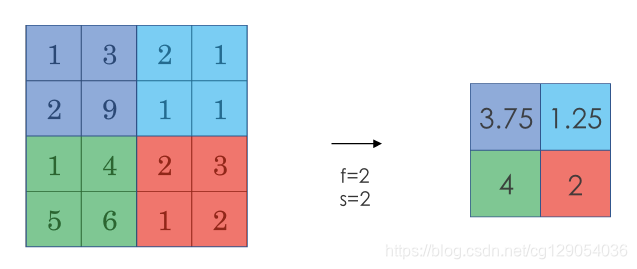 另一种池化过程是平均池化(Average Pooling),就是从取某个区域的最大值改为求这个区域的平均值: