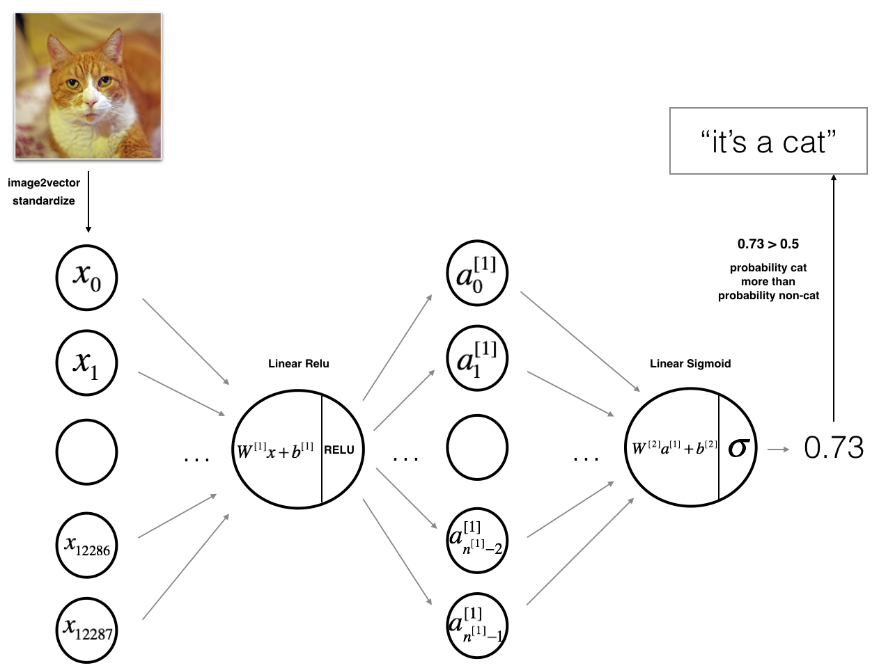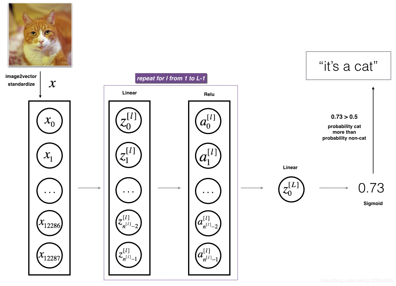 The model can be summarized as: ***[LINEAR -> RELU] ×× (L-1) -> LINEAR -> SIGMOID***
