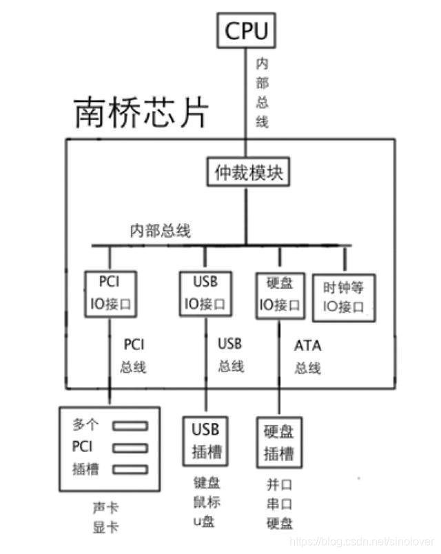 同一时刻,cpu只能和一个IO接口通讯,当很多的IO接口同时想和cpu对话时,面对众多接口的爱慕,cpu会选择和谁单独一叙呢?这个工作不应该由cpu来做,前面说过啦,cpu太忙了,还是好钢使在刀刃上吧,既然分层能解决问题,咱们再加一层,这一层的责任是除了仲裁IO接口的竞争,还要连接各种内部总线。由于它的使命,它的名字就叫做输入输出控制中心ICH(I/O control hub),也就是南桥芯片。如图