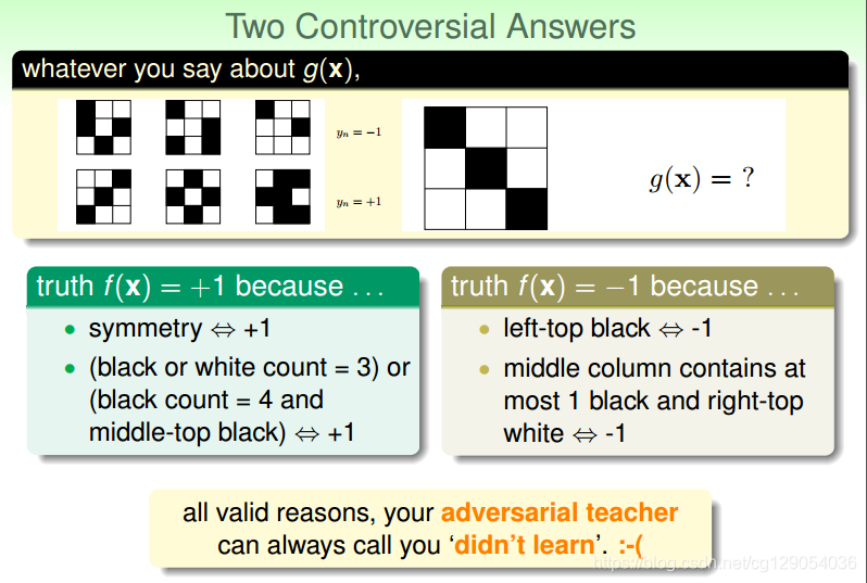 首先,我们看下面这样一个游戏。下面六6个九方格,根据这6个样本我们来推断出右边的九方格的标签是(-1)还是(+1)?可以看出,根据不同的特征进行分类,得到的结果完全不同。所有的分类可以说是合理的,也可以说是不合理的。
