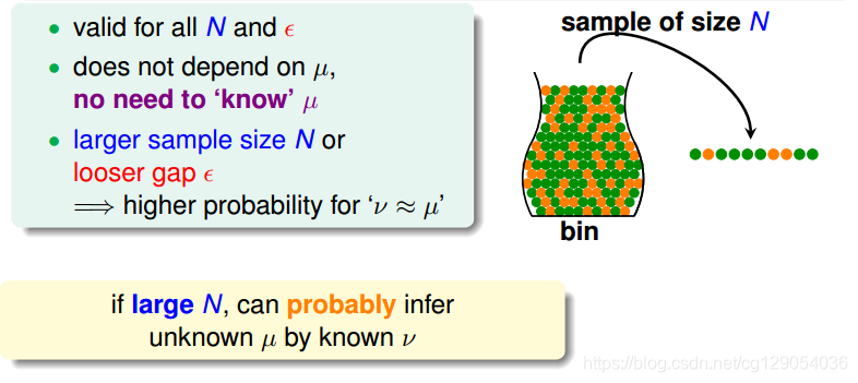 看下面一个例子,一个罐子中装满了橙色和绿色的小球。我们能否推断出橙色球的比例u?统计学的做法是这样的:随机取出N个样本,计算N各样本中橙色球的比例v,就估计橙色球的比例为v。