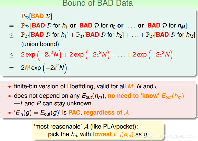 如果hypothesis的个数M是有限的,N足够大,那么通过演算法A任意选择一个g。都有。