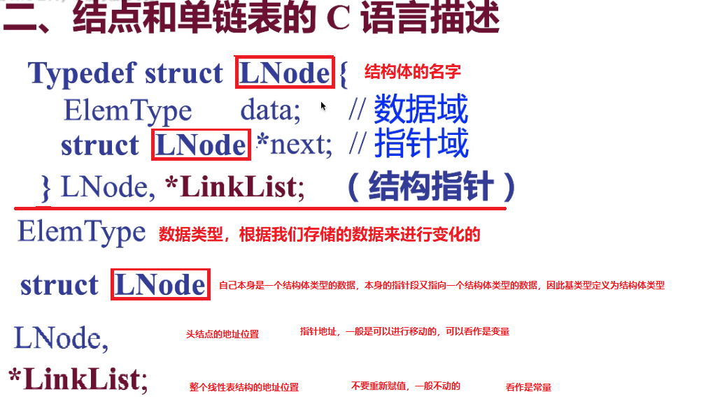 结构体定义的是单链表的结点所包含的内容,包括数据域以及指针域,结构一旦发生了变化,那么单链表的讨论就要发生变化
