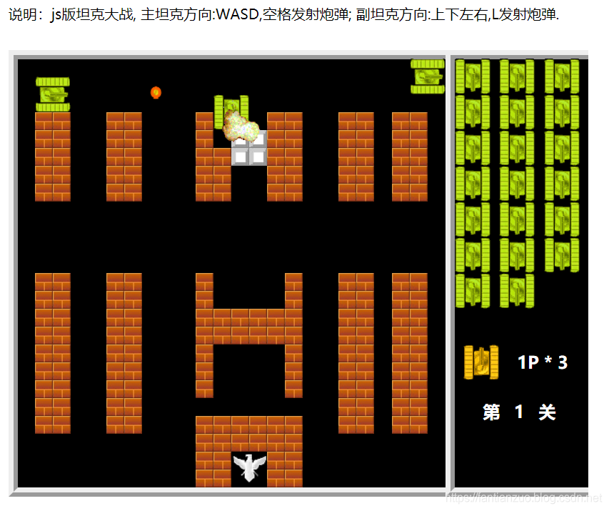 }function mapReload(){Gb.attr('gameMap').empty();Gb.attr('#infoBottom').empty();$(document).keydown(function(event){return false;});$(document).keyup(function(event){return false;});clearInterval(u);mainTank = null;subTank = null;eTanks = [];eTankLife = 20;map = maps[level-1];eTanksLength++;if (level == 3) {eTanksLength = 12;xs[2] = [0,2,4,6,8,10,12,14,16,18,20,22];}createMap();}}();</script><style>html, body{overflow:hidden}#game{width:650px;margin:0 auto;overflow:hidden;position:relative;height:600px;}#gameBg{height:480px;width:650px;margin:3px auto;border:10px ridge #eee;background:#000;overflow:hidden;position:absolute;left:00px;top:8%;z-index:1000}#gameBg div {width:100%;height:50%}#gameBg #topBg img {margin:30px auto;display:block}#gameBg #bottomBg img {margin:20px auto;display:block;cursor:pointer;height:40px;width:150px}#gameMap{height:480px;width:480px;margin:3px auto;border:10px ridge #eee;background:#000;overflow:hidden;position:absolute;left:00px;top:8%;float:left}#gameInfo{height:480px;width:150px;margin:3px auto;border:10px ridge #eee;background:#000;overflow:hidden;position:absolute;left:490px;top:8%}#gameMap span{width:20px;height:20px;float:left}#gameMap span.steel{background:url(img/steel.gif) no-repeat}#gameMap span.sea{background:url(img/sea.gif) no-repeat}#gameMap span.wall{background:url(img/wall.gif) no-repeat;position:relative;z-index:104}#gameMap span.ston{background:url(img/ston.gif) no-repeat}#gameMap span.tank{position:absolute;background:url(img/tank.gif) no-repeat; width:40px; height:40px;z-index:101}#gameMap span.etank{background:url(img/etank.gif) no-repeat; position:absolute; width:40px; height:40px;z-index:101}#gameMap span.ball{background:url(img/ball.gif) no-repeat; position:absolute; width:40px; height:40px;z-index:103}#gameMap span.aa{background:url(); width:20px; height:20px}#gameMap span.explode{background:url(img/explode.gif) no-repeat; position:absolute; width:60px; height:60px;z-index:103}#gameMap span.props{background:url(); width:20px; height:20px; position:absolute;z-index:101}#gameMap span.info{position:absolute; width:60px; height:60px; top:100;left:100;z-index:102}#gameMap span.AC{background:url(img/1.gif) no-repeat;position:absolute; width:40px; height:40px;z-index:102}#gameInfo span.etankSam{background:url(img/etank.gif) no-repeat 0px -80px; width:40px; height:40px;float:left;margin-right:10px}#gameInfo span.play1, .play2{background:url(img/tank.gif) no-repeat; width:100%; height:40px;float:left;margin-top:25px;margin-left:10px;color:#fff;text-indent:60px;Font-weight:bold;font-size:1.2em;line-height:40px}#gameInfo span.level{width:100%;height:30px;float:left;margin-top:20px;color:#fff;text-align:center;font-weight:bold;font-size:1.2em;line-height:30px;letter-spacing:5px}#gameInfo #infoBottom{position:absolute; width:100%; height:200px; top:295px;left:0px}#gameOver{height:480px;width:650px;margin:3px auto;border:10px ridge #eee;background:#000;overflow:hidden;position:absolute;left:0px;top:8%;display:none;z-index:1001}#gameOver img{height:100%;width:100%}#desc img{width:100%;}