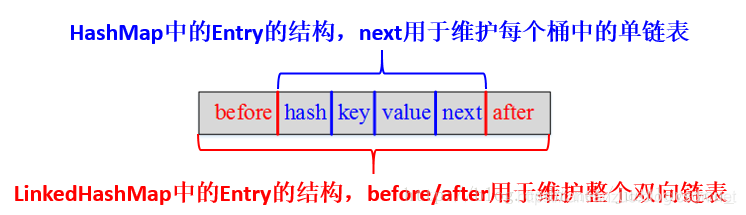 static class Entry<K,V> extends HashMap.Node<K,V> {Entry<K,V> before, after;Entry(int hash, K key, V value, Node<K,V> next) {super(hash, key, value, next);}