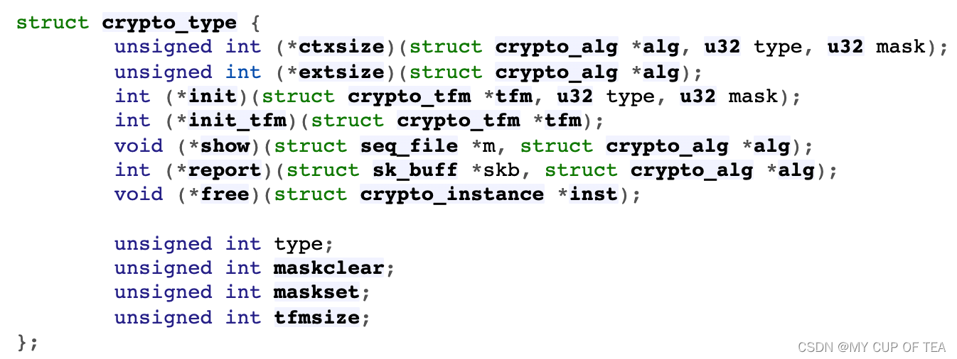 - crypto_tfm类型指针tfm可以理解为指代了一个算法对象