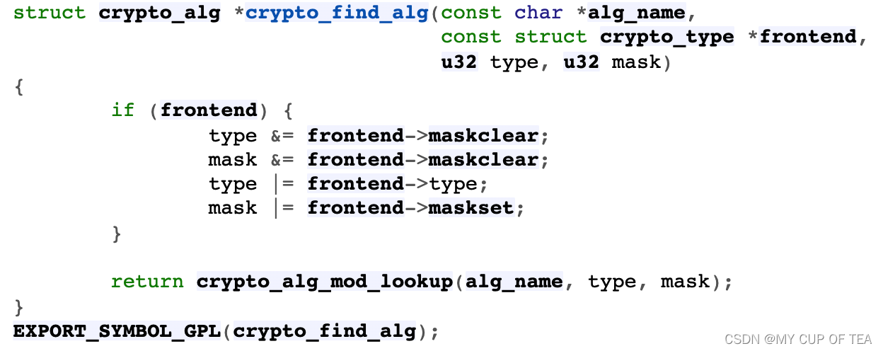 - crypto_find_alg函数的处理逻辑比较简单,调用查找接口lookup进行算法查找。如果算法前端frontend定义了查找接口,lookup=frontend->lookup,否则lookup=crypto_alg_mod_lookup。(截止到目前为止 版本v5.15.12 不支持,1,frontend的类型是crypto_type,里面没有这个函数接口;2,函数crypto_alg_mod_lookup的返回类型是 crypto_alg)