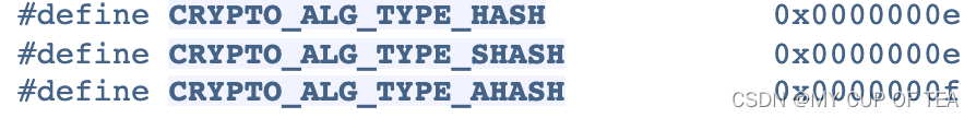 - 输入参数中的算法类型type表示最佳的算法类型,type&mask表示允许使用的算法类型。异步哈希算法实例前端crypto_ahash_type中,type=CRYPTO_ALG_TYPE_AHASH(0x09)表示最佳的算法类型为异步哈希算法,mask=CRYPTO_ALG_TYPE_AHASH_MASK(0x0C),而type&mask=0x08(CRYPTO_ALG_TYPE_HASH)表示只要是哈希算法就行,不强求实现方式。