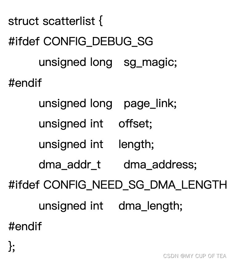 struct scatterlist用于描述一个在物理地址上连续的内存块(以page为单位),它的定义位于“include/linux/scatterlist.h”中,如下: