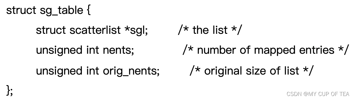 不过呢,为了使用者可以偷懒,kernel抽象出来了一个简单的数据结构:struct sg_table,帮忙保存scatterlist的数组指针和长度
