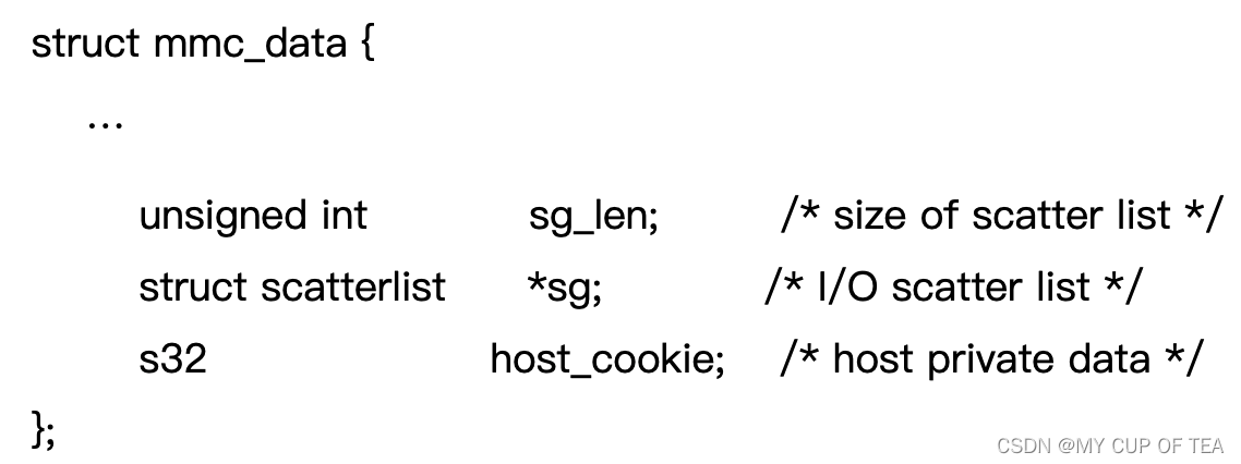- 多个scatterlist组成一个数组,以表示在物理上不连续的虚拟地址空间。通常情况下,使用scatterlist功能的模块,会自行维护这个数组(指针和长度),例如[2]中所提到的struct mmc_data: