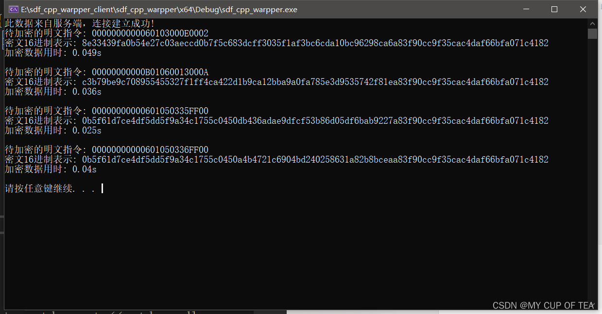 }void sm4_encrypt_decrypt_demo(const char* input_data,int length,char* outbuffer,int & out_buffer_true_length) {sdf_qax::SDF_warpper sdf_warpper("{\"device_type\": \"rpc\",\"device_socket\": \"172.22.14.231:5000\"}");char a[32]{};memcpy(a, input_data,length);std::cout << "待加密的明文指令: ";for (auto i : a) {std::cout << i;} bytes input(a, a + 24);sdf_warpper.sm4_symmetry_encrypt((uint8_t*)sdf_warpper.getStaticKey(), a, sizeof(a) / sizeof(char), outbuffer, &out_buffer_true_length);bytes input_2(outbuffer, outbuffer + out_buffer_true_length);std::cout << std::endl; std::cout << "密文16进制表示: ";std::cout << BytesToStr(input_2) << std::endl;char decrypt_result[32]{ 0 };int out_true_length = 0;sdf_warpper.sm4_symmetry_decrypt((uint8_t*)sdf_warpper.getStaticKey(), outbuffer, out_buffer_true_length, decrypt_result, &out_true_length);