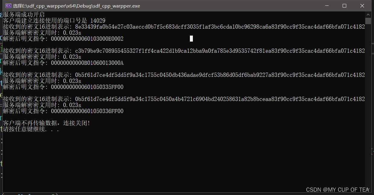}void main() {//Initialze winsockWSADATA wsaData;if (WSAStartup(MAKEWORD(2, 2), &wsaData) != 0){std::cout << "Can't Initialize winsock!Quiting!" << std::endl;;return;}//Creste a sockrtSOCKET sockClient = socket(AF_INET, SOCK_STREAM, 0);if (sockClient == INVALID_SOCKET) {wprintf(L"Can't create a socket with error %d\n", WSAGetLastError());WSACleanup();return;}//Bind the socket to an ip address and portint port = 5099;SOCKADDR_IN addrSrv;addrSrv.sin_family = AF_INET;addrSrv.sin_port = htons(5099);//addrSrv.sin_addr.S_un.S_addr = inet_addr("127.0.0.1");inet_pton(AF_INET, "127.0.0.1", &addrSrv.sin_addr.S_un.S_addr);char buff[1024];memset(buff, 0, sizeof(buff));//向服务器发出连接请求if (connect(sockClient, (struct sockaddr*) & addrSrv, sizeof(addrSrv)) == INVALID_SOCKET) {printf("Connect failed:%d", WSAGetLastError());return;}else{//接收数据recv(sockClient, buff, sizeof(buff), 0);printf("%s", buff);}char input_vec[][24] = { { '0','0','0','0','0','0','0','0','0','0','0','6','0','1','0','3','0','0','0','E','0','0','0','2'},{ '0', '0', '0', '0', '0', '0', '0', '0', '0', '0', '0', 'B', '0', '1', '0', '6', '0', '0', '1', '3', '0', '0', '0', 'A'},{ '0', '0', '0', '0', '0', '0', '0', '0', '0', '0', '0', '6', '0', '1', '0', '5', '0', '3', '3', '5', 'F', 'F', '0', '0' } ,{ '0', '0', '0', '0', '0', '0', '0', '0', '0', '0', '0', '6', '0', '1', '0', '5', '0', '3', '3', '6', 'F', 'F', '0', '0' } };for (int i = 0;i < 4;i++) {char outbuffer[32]{ 0 };int out_buffer_true_length = 0;clock_t start, end;start = clock(); //开始时间sm4_encrypt_decrypt_demo(input_vec[i], 24, outbuffer, out_buffer_true_length);end = clock(); //结束时间std::cout << "加密数据用时: " << double(end - start) / CLOCKS_PER_SEC << "s" << endl; //输出时间(单位:s)char sendbuf[2048];ZeroMemory(sendbuf, 2048);strcpy_s(sendbuf, outbuffer);if (send(sockClient, sendbuf, out_buffer_true_length, 0) == SOCKET_ERROR) {wprintf(L"send failed with error: %d\n", WSAGetLastError());closesocket(sockClient);WSACleanup();exit(-1);}std::cout << std::endl;}//关闭套接字closesocket(sockClient);WSACleanup();system("pause");