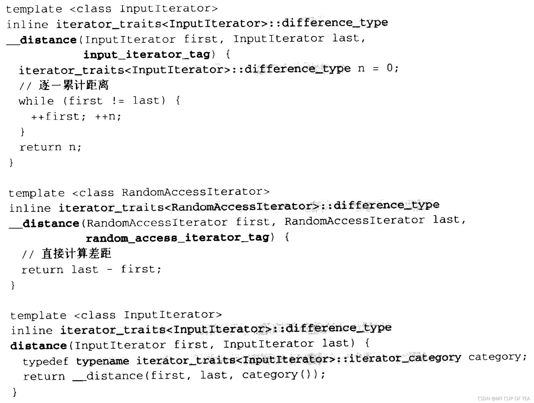 - distance可以接受任何类型的迭代器,但是template型别参数设置为InputIterator,是为了遵循STL算法的命名规则,使用最低级的迭代器命名