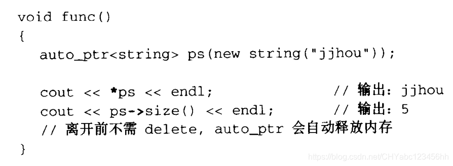 - 函数第一行的意思是,以算式new动态配置一个初值为"jjhou” 的 string 对象,并将所得结果(一个原生指针)作为aUtoj>tr<Strin g > 对象的初值。注意, auto_ptr角括号内放的是“原生指针所指对象”的型别,而不是原生指针的型别.