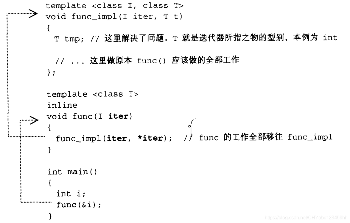 - 我们以func ()为对外接口,却把实际操作全部置于func_impl()之中.由于 func_impl ()是一个function template,—旦被调用,编译器会自动进行template参数推导。于是导出型别T,顺利解决了问题。