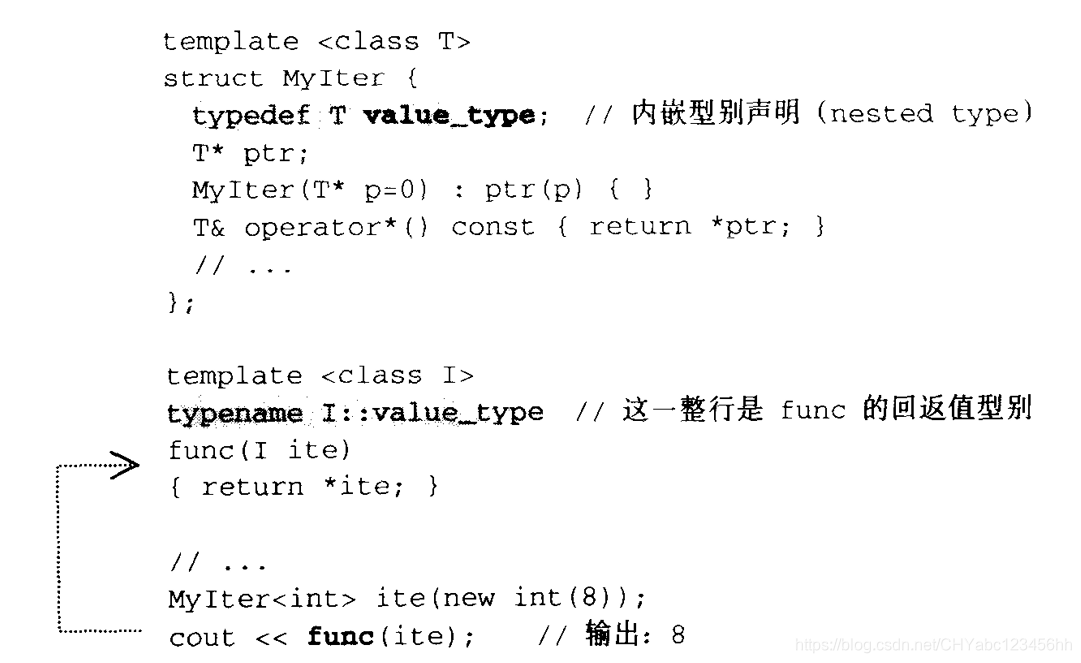- 注 意 ,func ( ) 的回返型别必须加上关键词typename , 因 为 T 是一个 template参数,在它被编译器具现化之前,编译器对T 一无所悉,换句话说,编 译器此时并不知道MyIter<T>: : value_type代表的是一个型别或是一个member function或是一个data m e m b e r . 关 键 词 typename的用意在于告诉编译器这是一个型别,如此才能顺利通过编译。