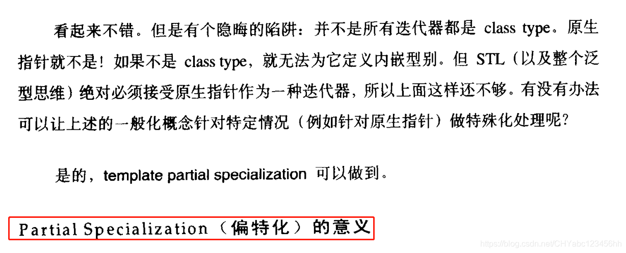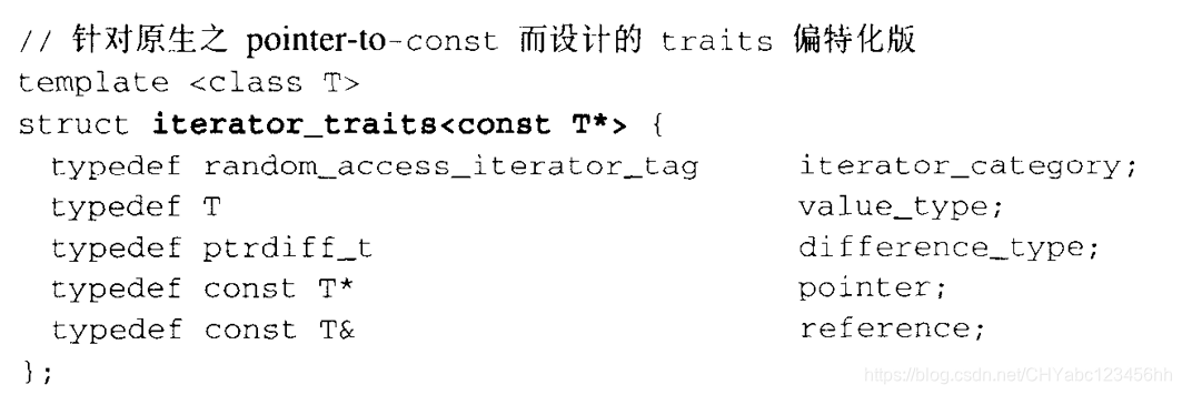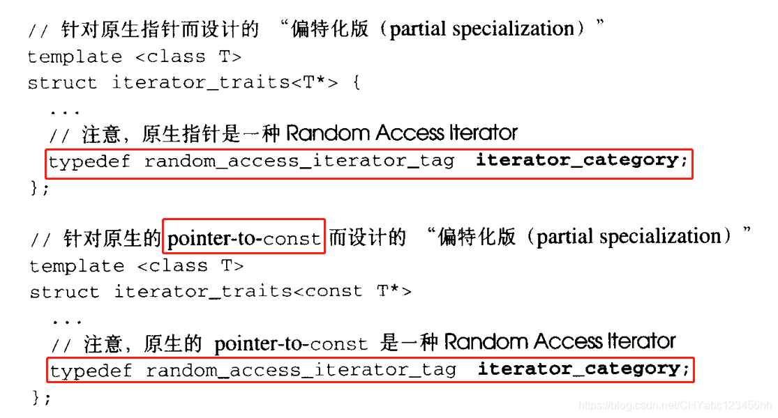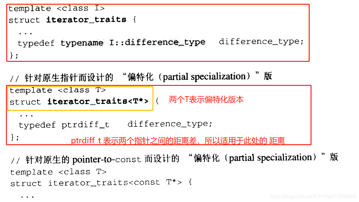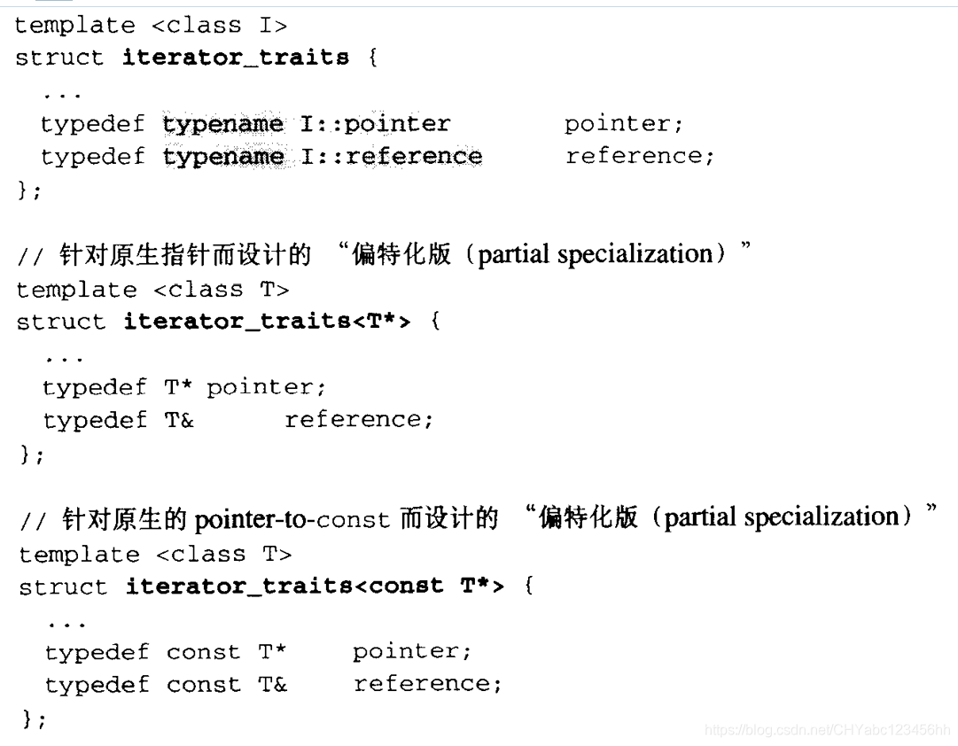 - 但这除了多一层间接性,又带来什么好处呢?好处是traits可以拥有特化版本。现在,我们令 iterator_traites 拥有一个 partial specializations 如下