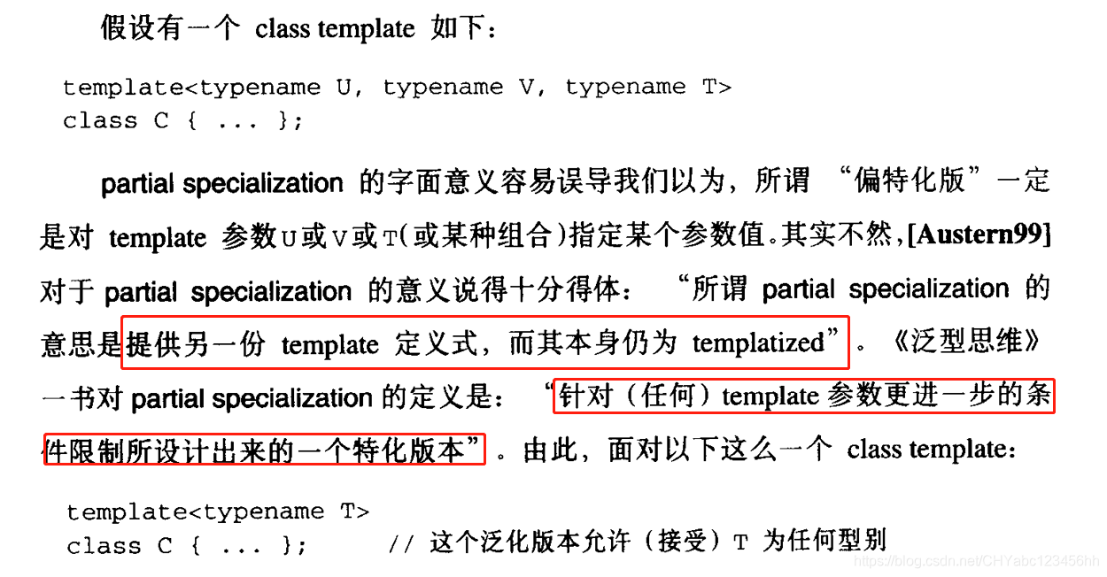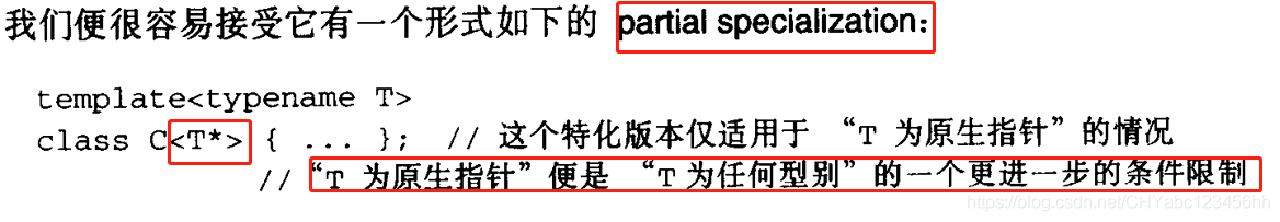 - 大致的意义是:如 果 class template拥有一个以上的 template参数,我们可以针对其中某个(或数个,但非全部)template参数进行特化工作。换句话说,我们可以在泛化设计中提供一个特化版本(也就是将泛化版本中的某些template参数赋予明确的指定)。