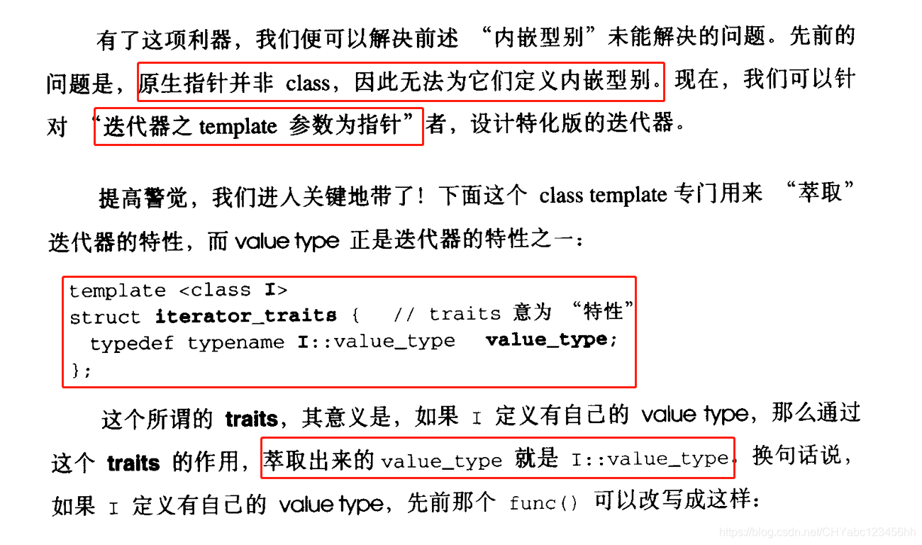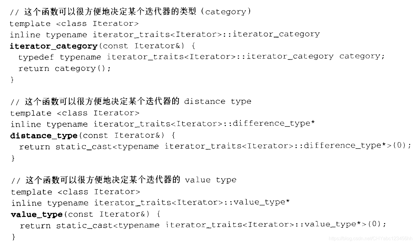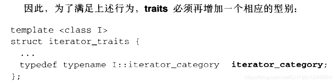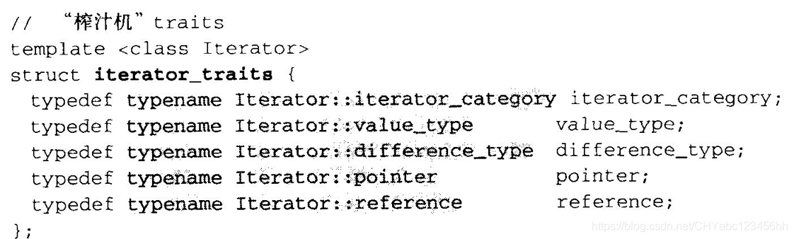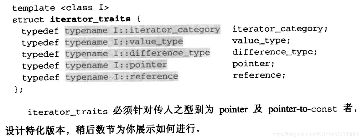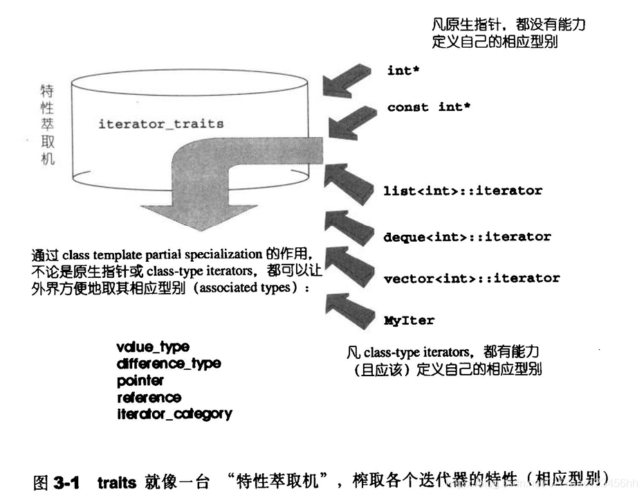 - 特性萃取机”角色,萃取各个迭代器的特性。 这里所谓的迭代器特性,指的是迭代器的相应型别(associated types)。当然,若 要 这 个 “特性萃取机” traits能够有效运作,每一个迭代器必须遵循约定,自行以内嵌型别定义(nested typedef)的方式定义出相应型别(associated types) 。这是一个约定,谁不遵守这个约定,谁就不能兼容于S T L 这个大家庭。