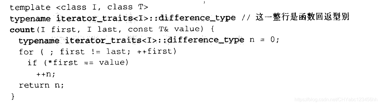 - 如果一个泛型算法提供计数功能,例如STL的 count(), 其传回值就必须使用迭代器的 difference type: