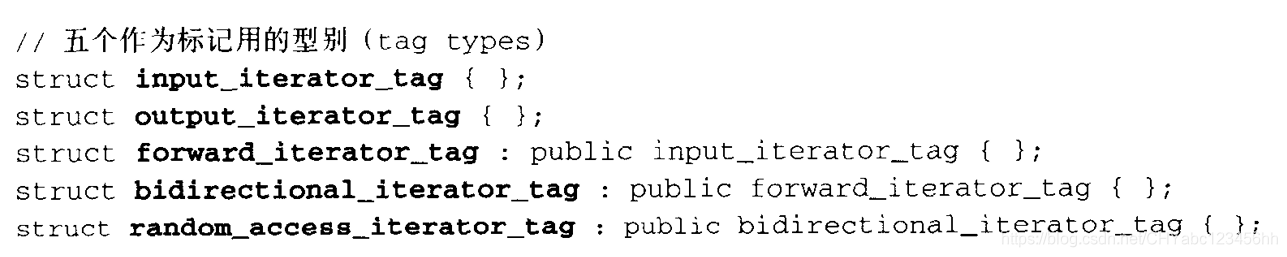 - 设计考虑如下:如 果 traits有能力萃取出迭代器的种类,我们便可利用这个 “迭代器类型”相应型别作为advanced 0 的第三参数。这个相应型别一定必须是一个class type,不能只是数值号码类的东西,因为编译器需仰赖它(一个型别)来进行重载决议(overloaded resolution) o 下面定义五个classes,代表五种迭代器类型: