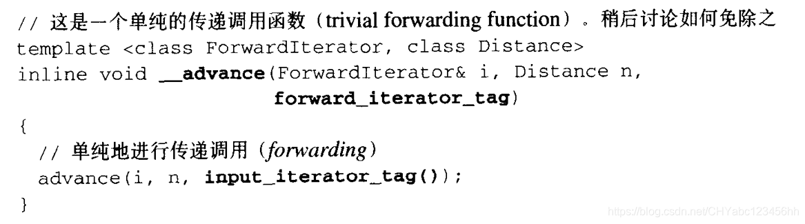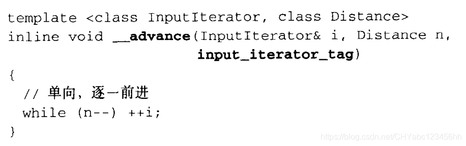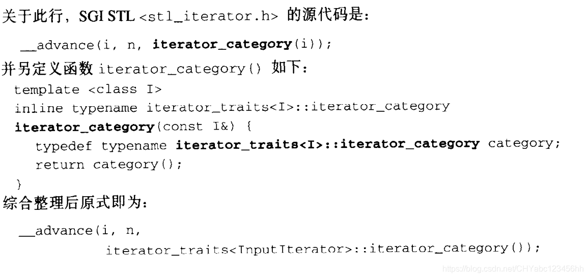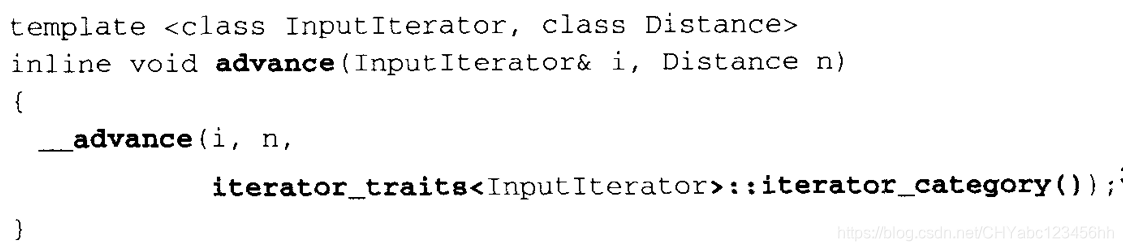 - 行进至此,还需要一个对外开放的上层控制接口,调用上述各个重载的_advance()。这一上层接口只需两个参数,当它准备将工作转给上述的 _advance ()时,才自行加上第三参数:迭代器类型。因此,这个上层函数必须有 能力从它所获得的迭代器中推导出其类型—— 这份工作自然是交给traits机制: